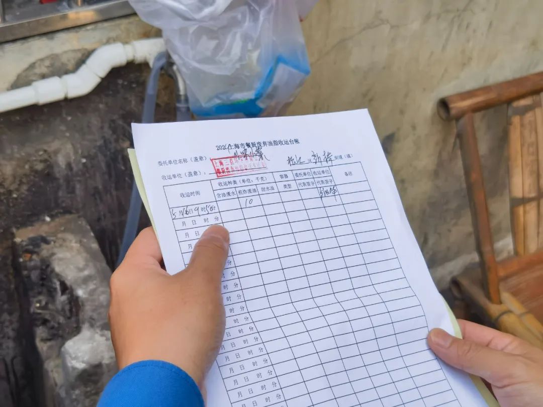 同时,执法团队还核实了商铺的台账和回收清单,了解餐饮废水的处理流程和去向,以判断是否存在乱排餐饮废水的行为。